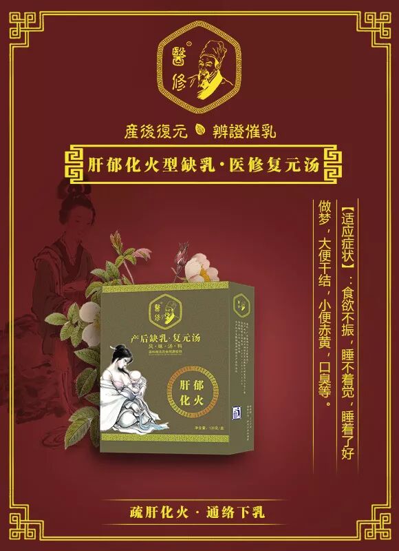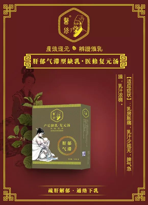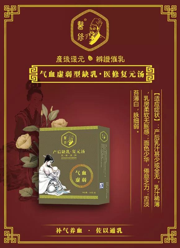 医修缺乳型复元汤——适应于产后乳汁甚少或全无,乳汁稀薄,乳房柔软五胀感;面色少华,倦怠乏力;舌淡苔薄白,脉细弱