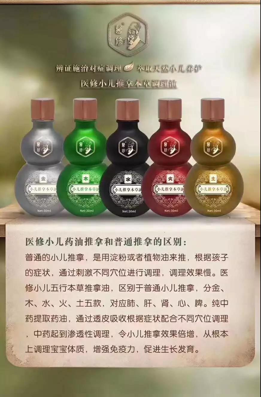 医修小儿五行本草推拿油,区别于普通小儿推拿,分金,木,水,火,土五款,对应肺,肝,肾,心,脾。