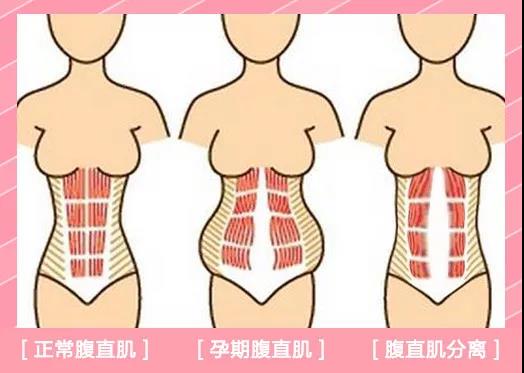 左图:正常腹直肌;图中:怀孕中腹直肌变化;右图:腹直肌分离