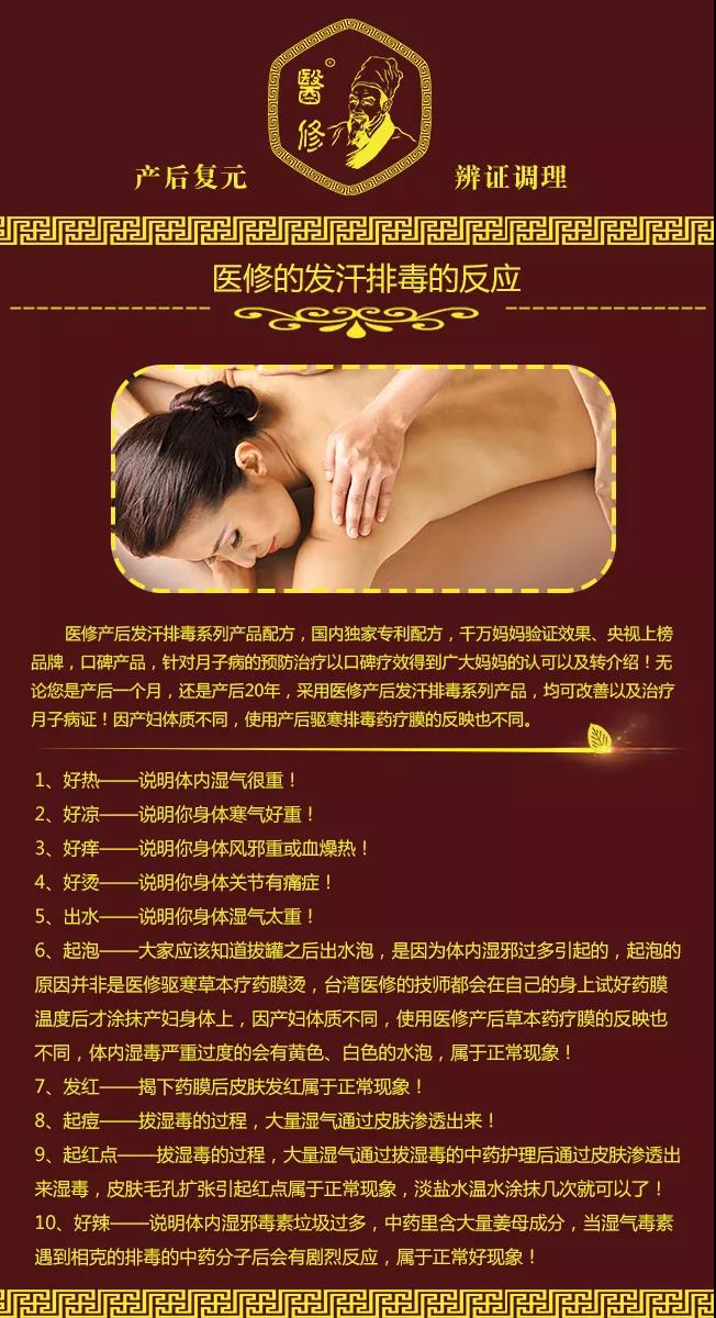采用央视上榜品牌发汗中药,采用透皮靶向微囊渗透技术,涂抹于产妇各个关节部位以及后背,充分渗透吸收,改善产妇体寒体质的 同时,彻底将产妇体内的风寒湿邪排出体外。