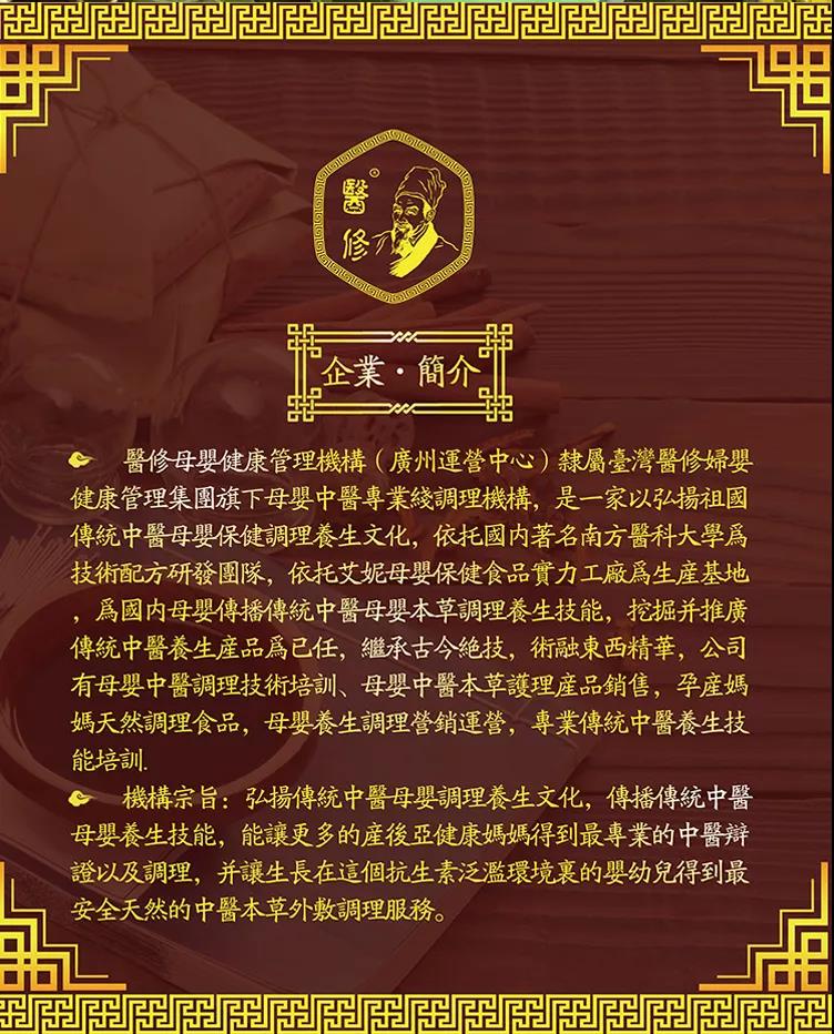 医修母婴健康管理机构隶属香港艾妮旗下母婴中医专业调理机构,医修中医产品由香港和内地众多著名专家组成庞大的中医专家研究团,依托艾妮母婴保健食品厂,汲取了中华五千年中医养生之道,利用高科技提取的中药植物精华,针对产后妈妈和婴儿身体状态,精心调配而成,近百个品种,专业服务母婴,为产后妈妈婴幼儿提供品质保证!
